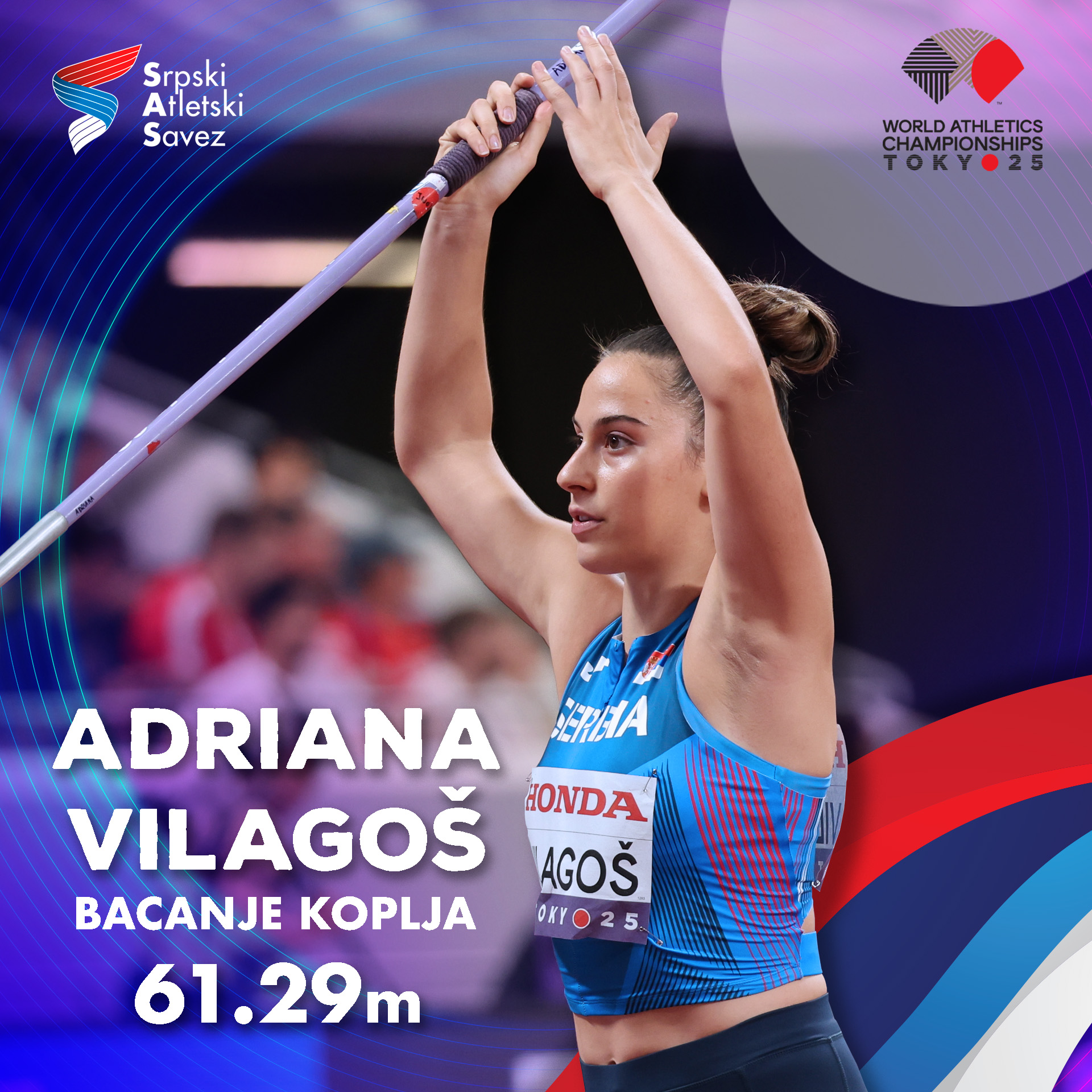 Srpska reprezentativka Adriana Vilagoš zauzela je osmo mesto u finalu bacanja koplja na Svetskom prvenstvu u Tokiju hicem od 61.29 metara.